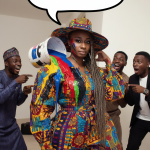 The image before you is bold, colorful, and deeply symbolic. At first glance, it might seem humorous — a confident woman dressed in vibrant African prints, standing tall while a bucket of paint spills over her shoulder. Around her, three men react with visible shock, laughter, and amazement. Above her, a thought-provoking message reads: “What…